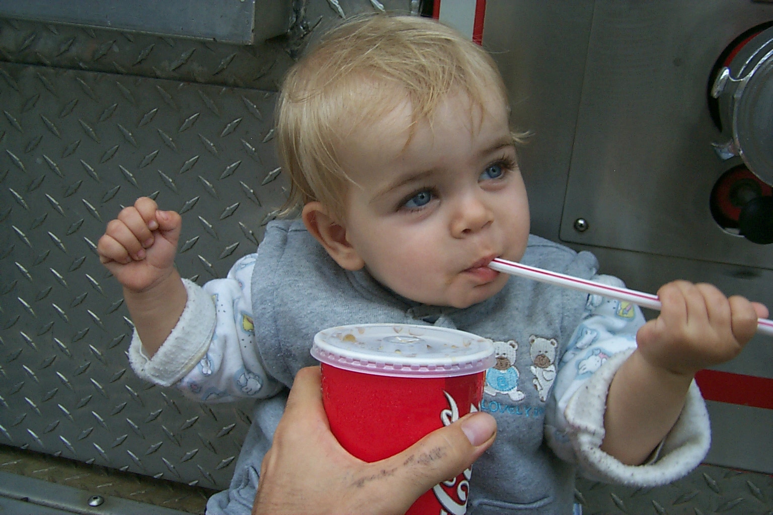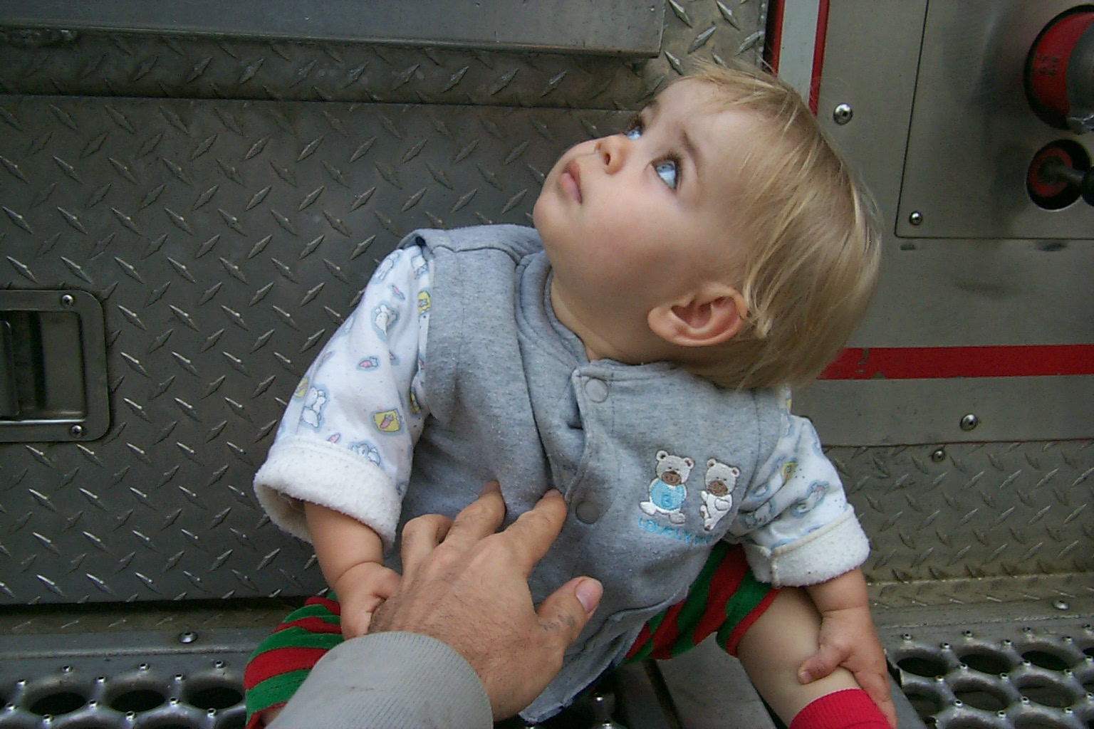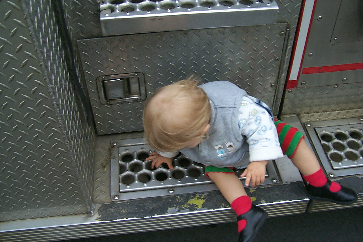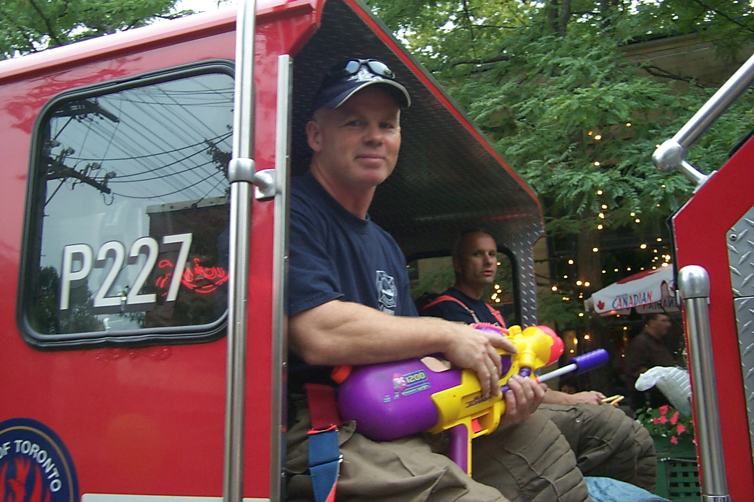 Firemen showing off their fire truck. Daddy asked them about the squirt gun, and they mentioned it was to spray at the other firemen, in case they couldn't get their short length of firehose hooked up in time to spray at the other truck when it's passing by.