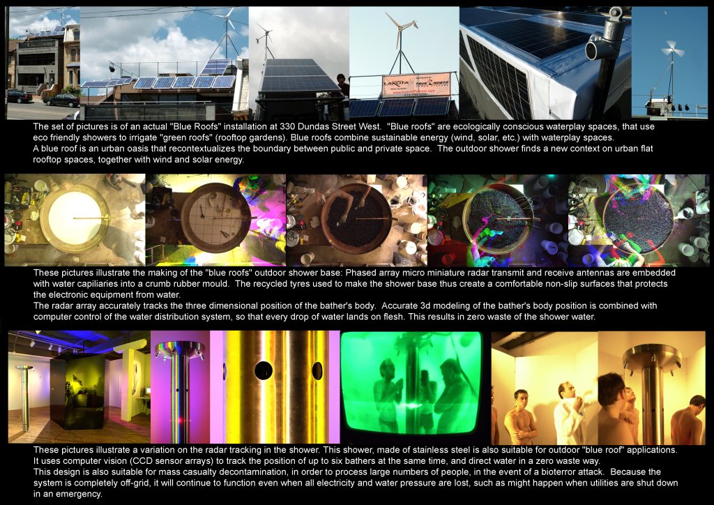 The bottom row of pictures illustrate a variation on the radar tracking in the shower. This shower, made of stainless steel is also suitable for outdoor "blue roof" applications. It uses computer vision (CCD sensor arrays) to track the position of up to six bathers at the same time, and direct water in a zero waste way. This design is also suitable for mass casualty decontamination, in order to process large numbers of people, in the event of a bioterror attack. Because the system is completely off-grid, it will continue to function even when all electricity and water pressure are lost, such as might happen when utilities are shut down in an emergency.