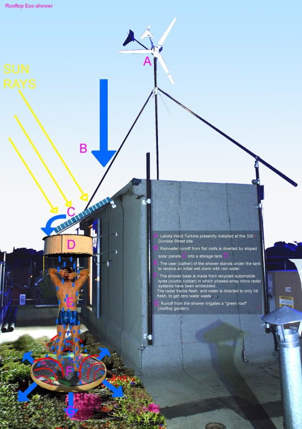 The bath is not a private island. We are all connected in a global ecosystem where we must conserve water for the public good. The blue roof shower is an outdoor ecosystem that reclaims previously unused flat mechanical rooftop space as an urban oasis. Renewable energy sources on the roof at 330 Dundas Street West, in Toronto, transform it into an electric energy production space, where wind, rain, and sun are all fully utilized.