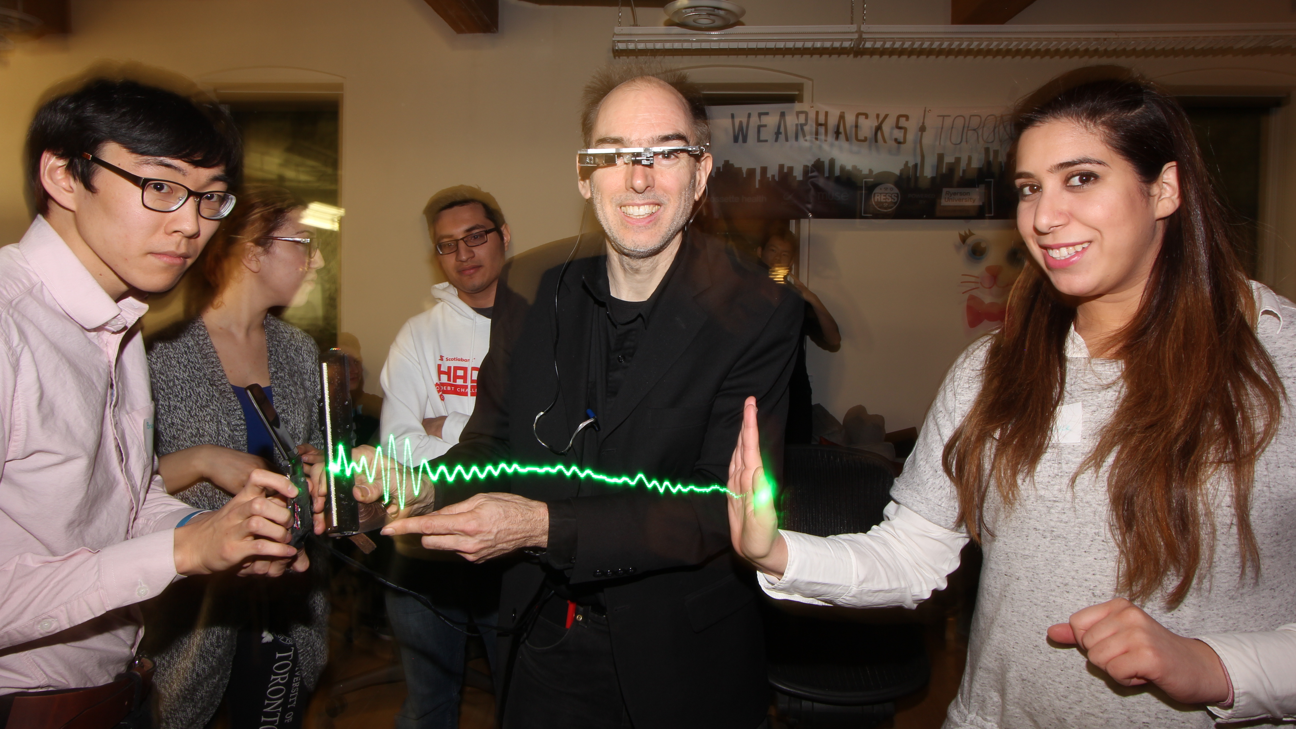 Among many live demos was the S.W.I.M. (Sequential Wave Imprinting Machine) wearable computing and augmented reality system Mann originally built at the age of 12, back in 1974, to measure the speed of light and the speed of sound, and, more importantly, to express radio waves in a coordinate system that moves at the speed of light, with the waves, so as to make them appear to sit still (or at the speed of sound for sound waves), as Phenomenological AR (Augmented Reality) overlays.