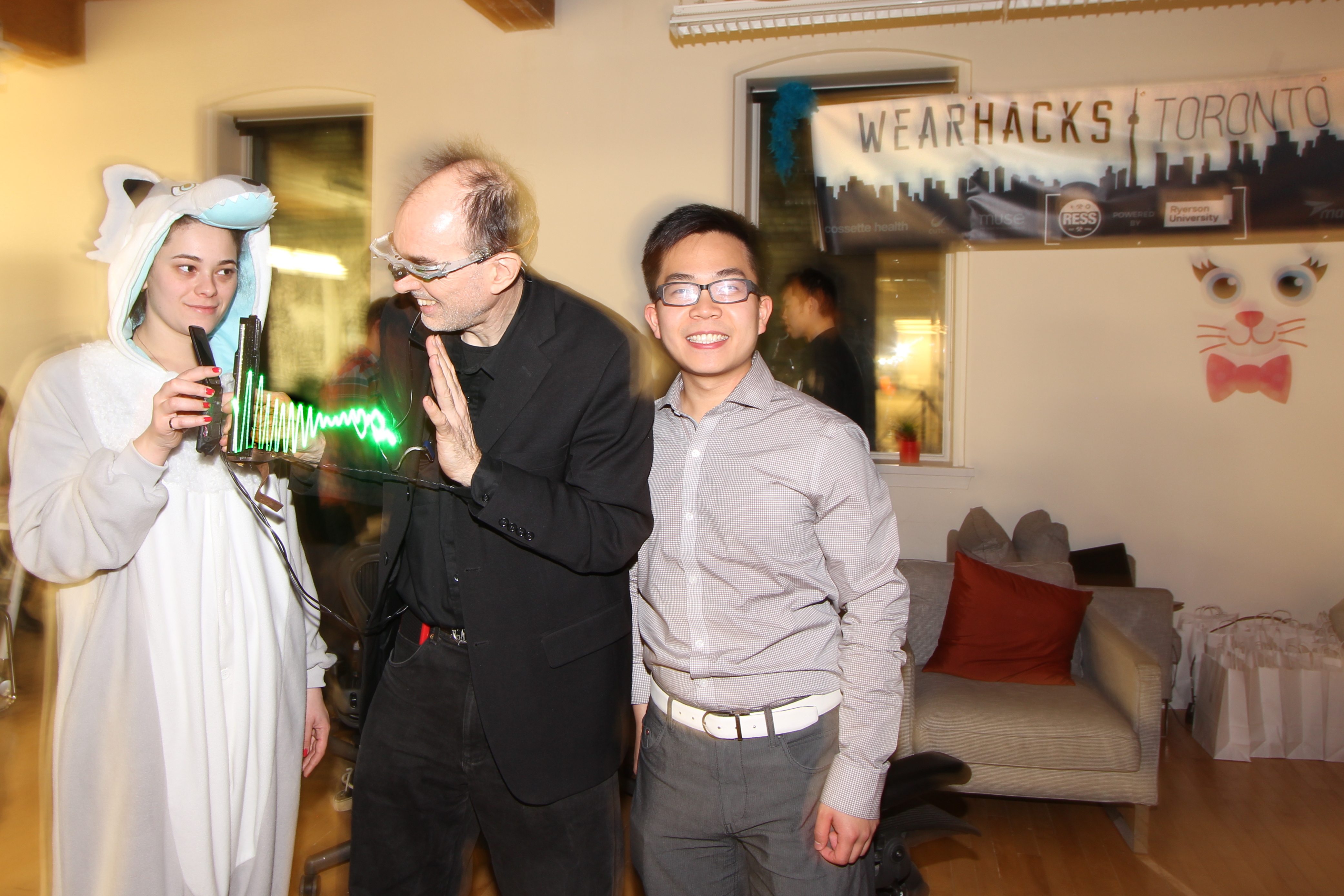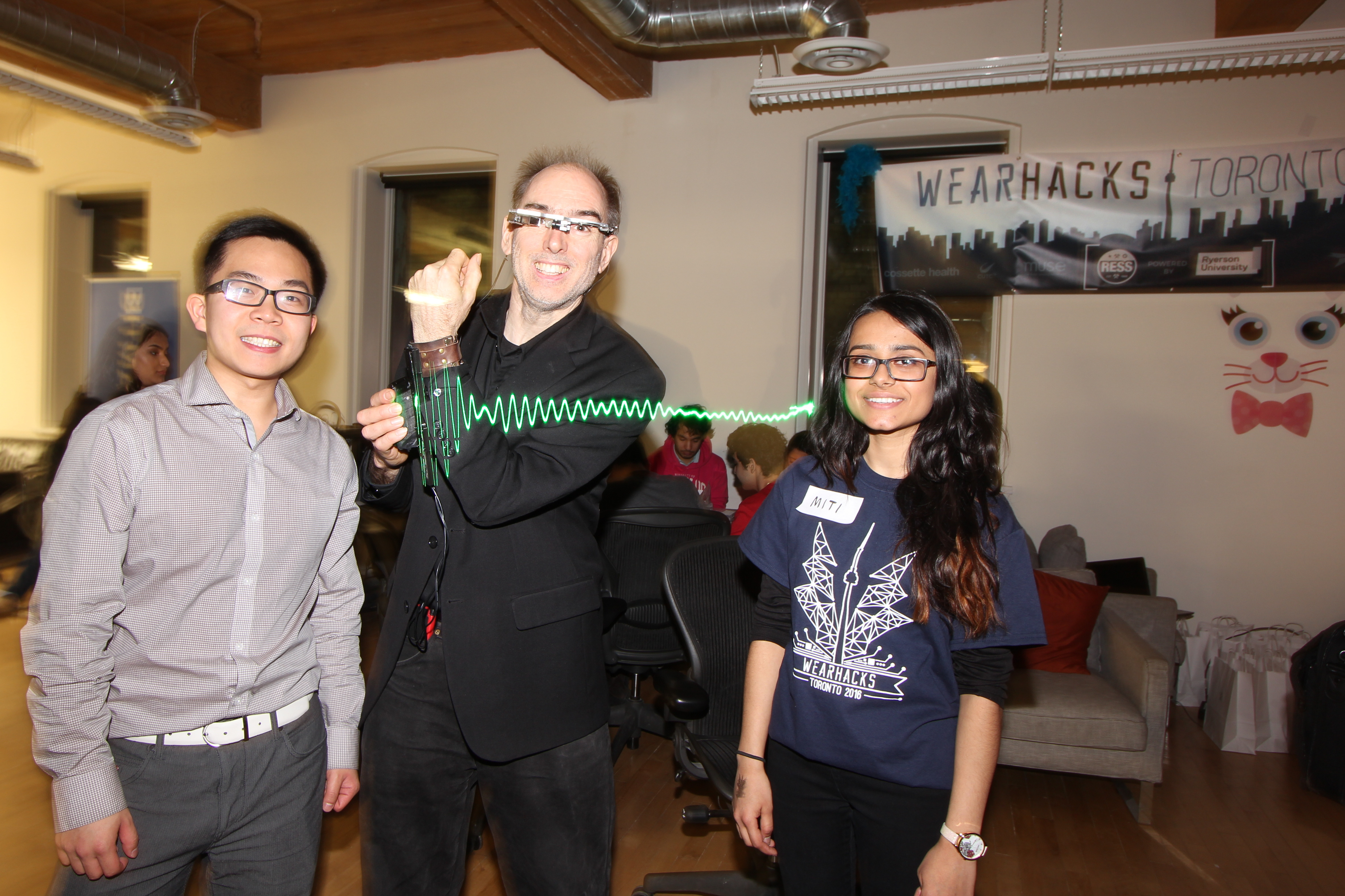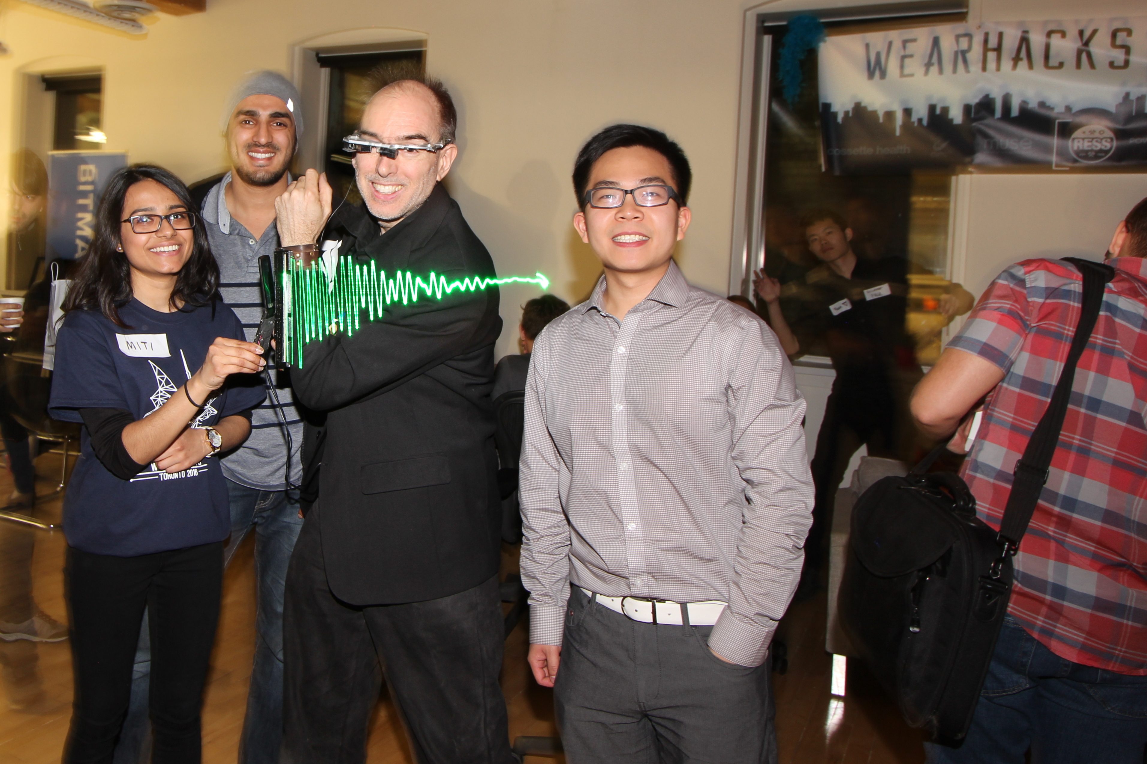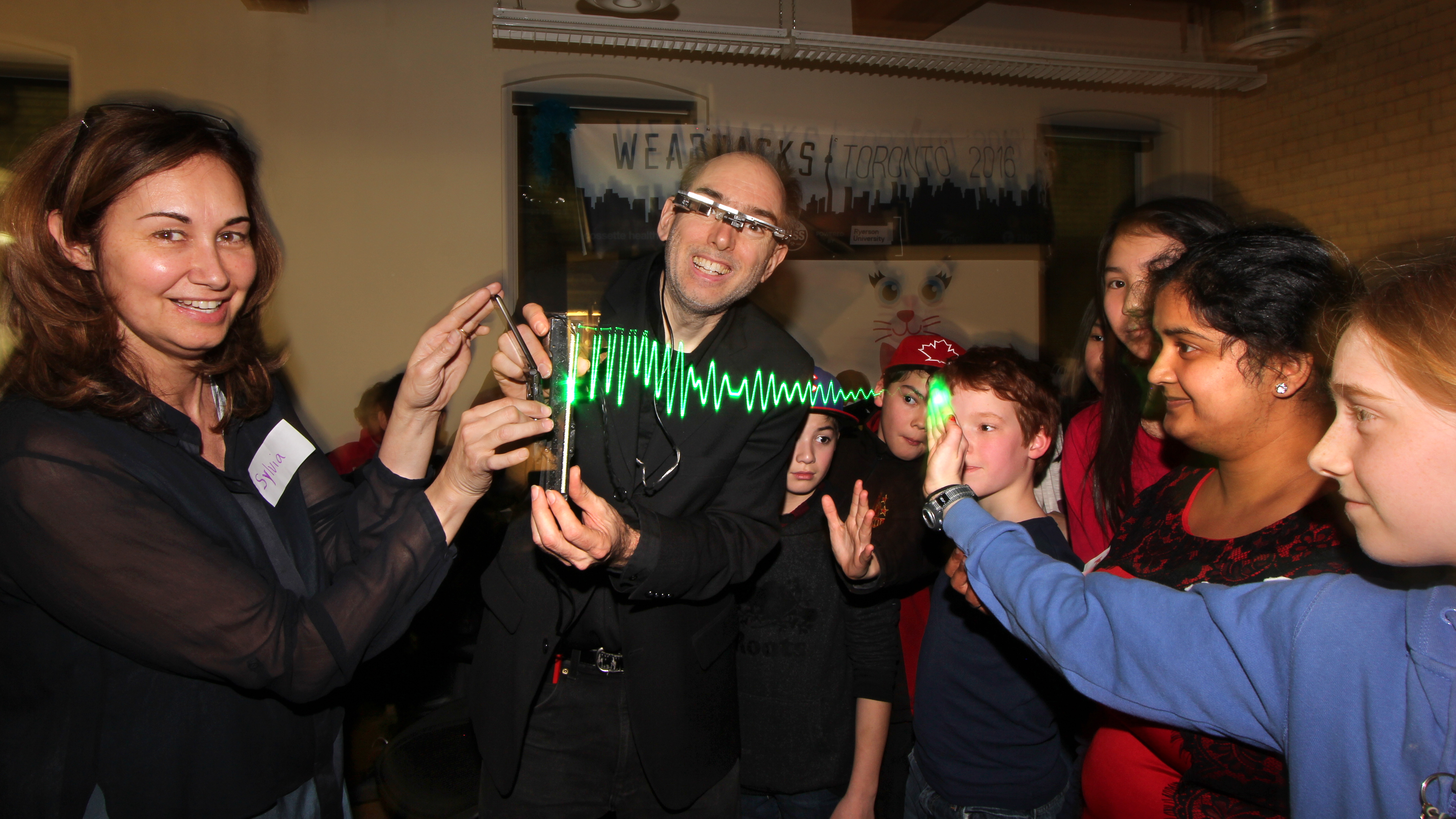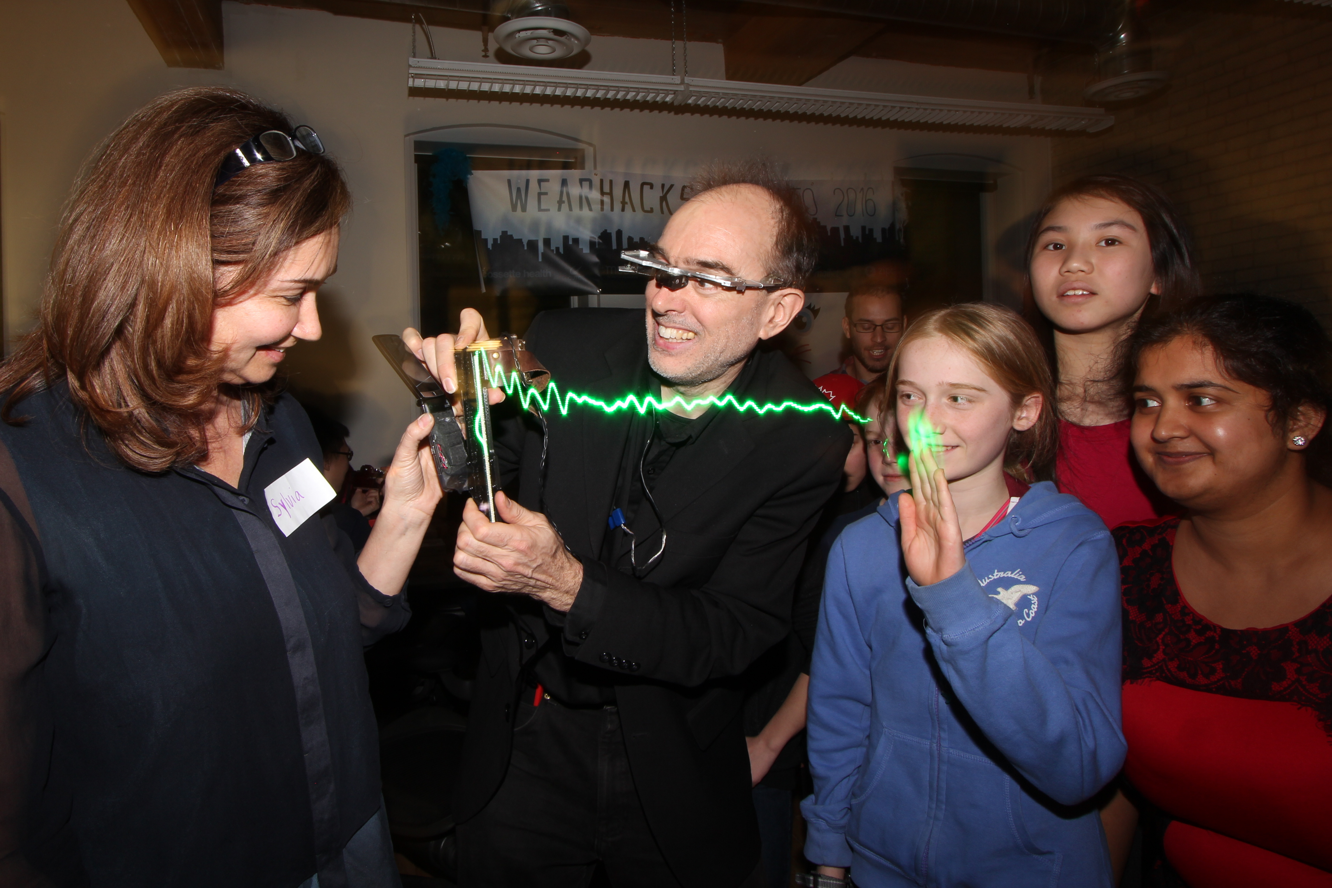 Among many live demos was the S.W.I.M. (Sequential Wave Imprinting Machine) wearable computing and augmented reality system Mann originally built at the age of 12, back in 1974, to measure the speed of light and the speed of sound, and, more importantly, to express radio waves in a coordinate system that moves at the speed of light, with the waves, so as to make them appear to sit still (or at the speed of sound for sound waves), as Phenomenological AR (Augmented Reality) overlays.