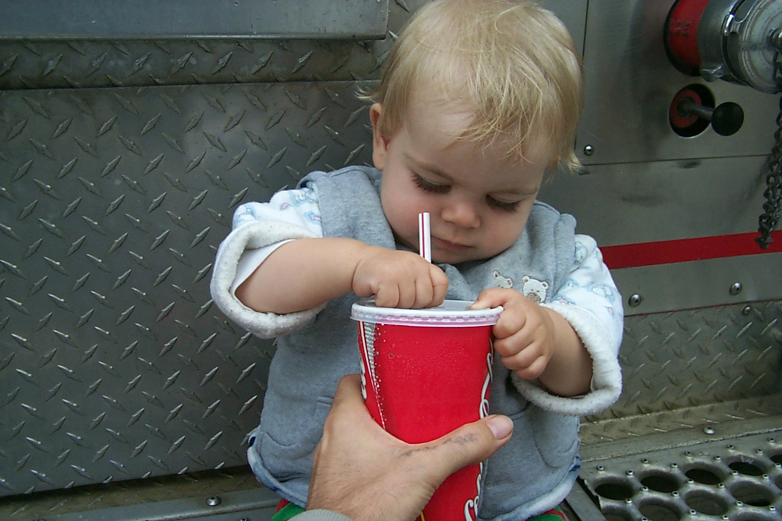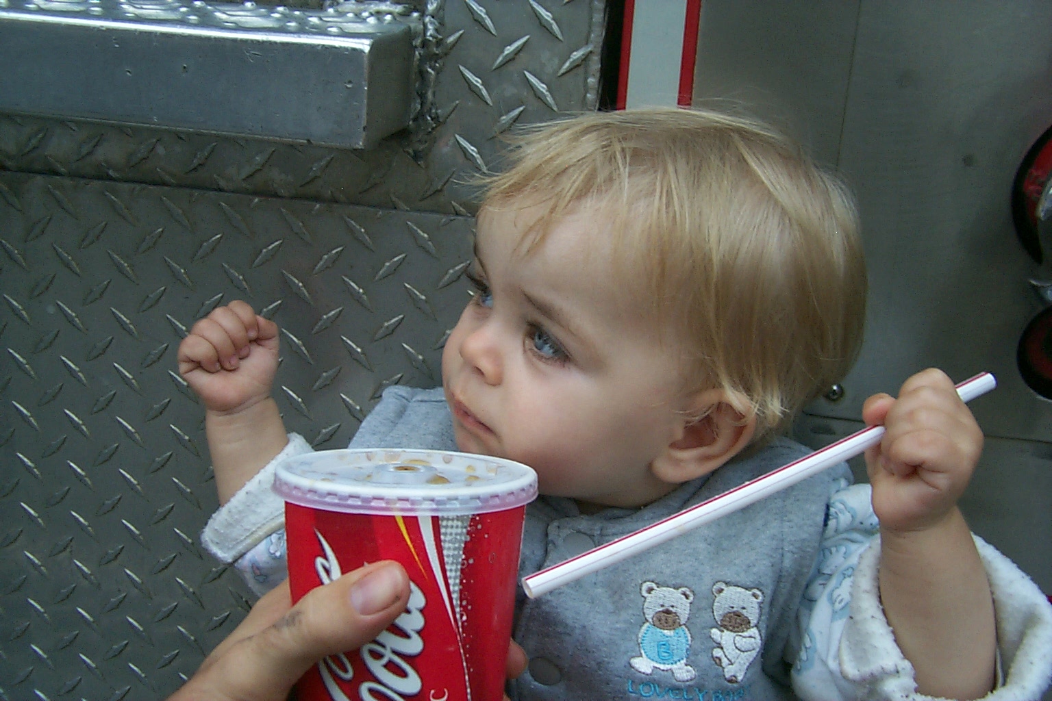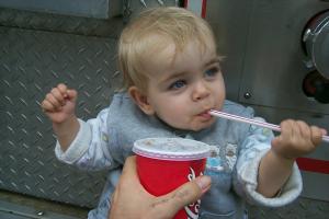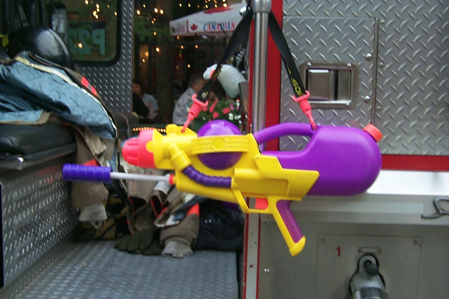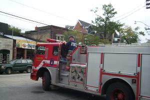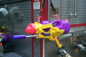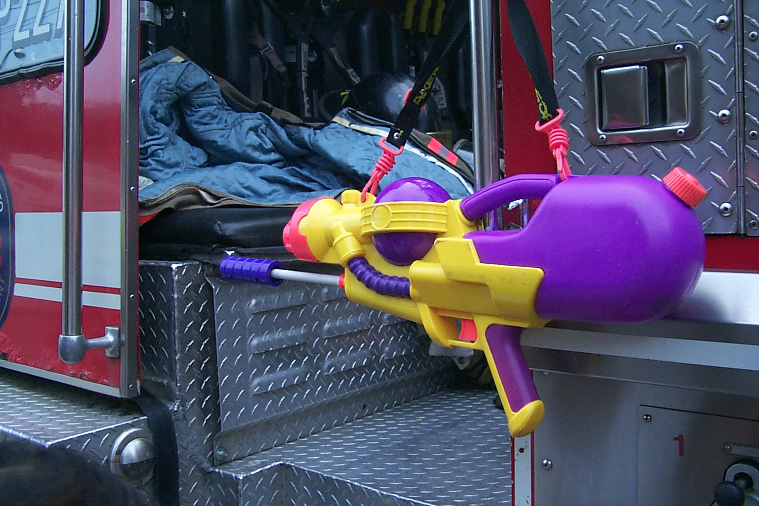 Firemen showing off their fire truck. Daddy asked them about the squirt gun, and they mentioned it was to spray at the other firemen, in case they couldn't get their short length of firehose hooked up in time to spray at the other truck when it's passing by.
