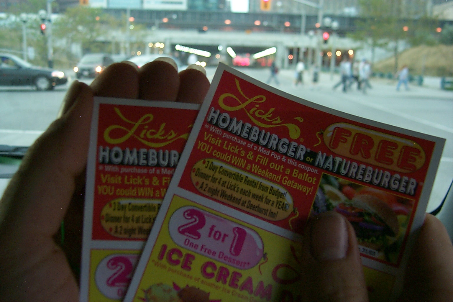 2 for 1 burgers at licks, and also they gave me a free helium-filled baloon: