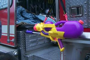 the fireMEN sure are proud of their firetruck, firehoses, and squirt gun!