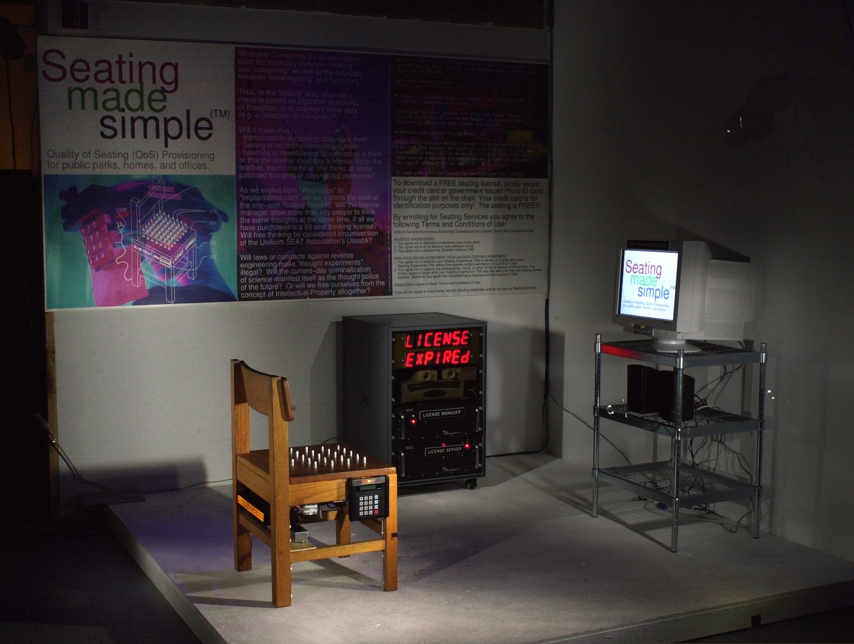 Here is the Internet Chair with magnetic stripe card reader and spikes that retract when a seating license is downloaded from a license server in response to input from the card reader incoroprated into the chair. The license server is in the 19 inch relay rack behind the Internet Chair.